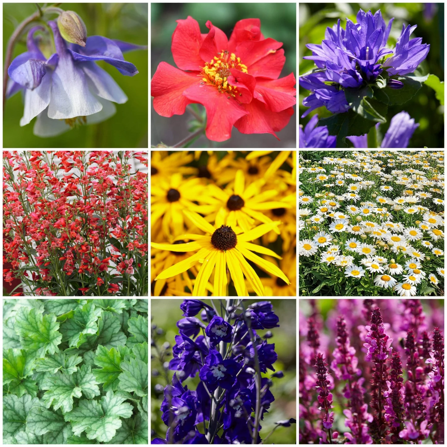 - Our grower will select the perfect mixture of 9 premium plants from a wide selection of perennials. These are the best performing varieties of the season, so will vary according to when you order – example varieties include Achillea, Salvia, Leucanthemum, Eryngium, Geum, Aquilegia, Poppy, Trollius, Heuchera and Rudbeckia