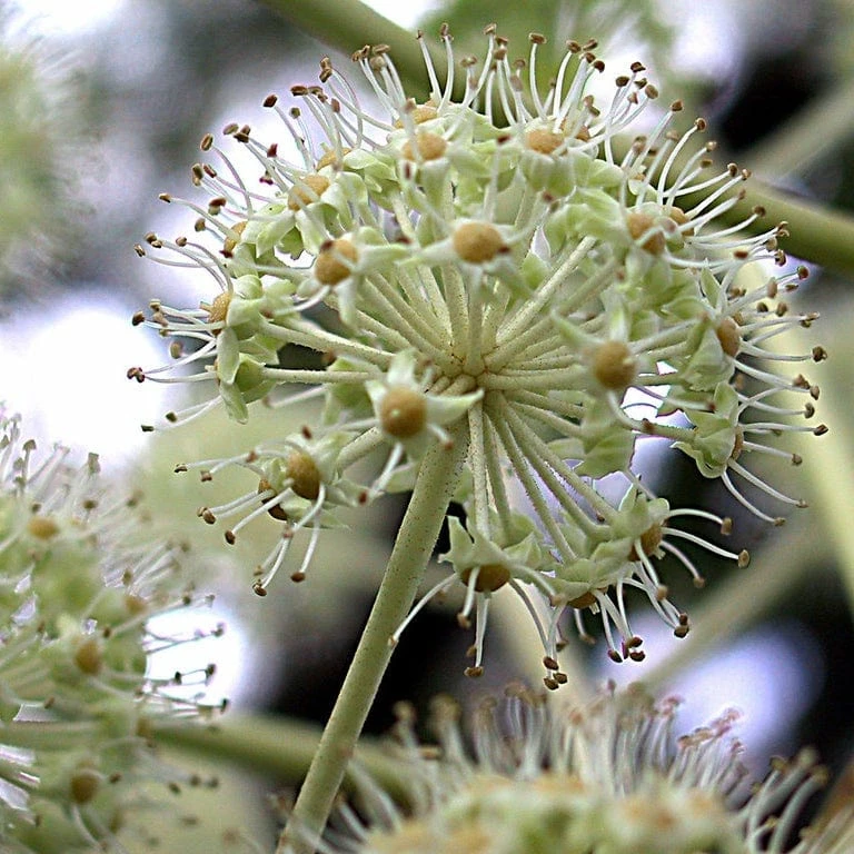 - Exotic, dark green palmate foliage (leaves up to 45cm!) with small clusters of creamy white flowers followed by small, black fruits
