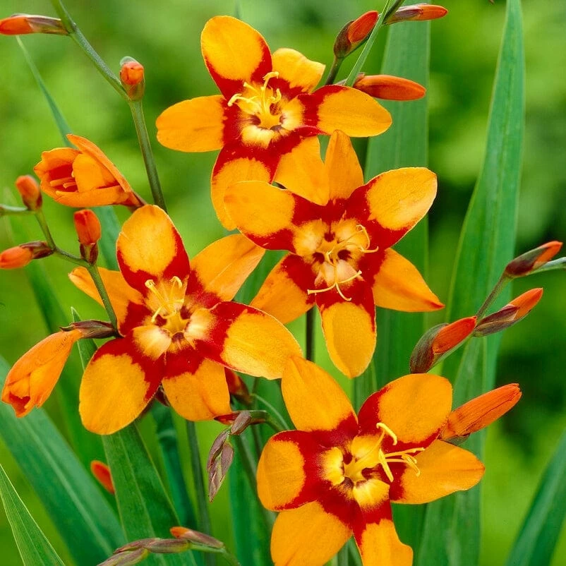 - Arching stems bearing an abundance of large, vivid orange flowers with a scarlet red centre, rising from bright green sword-like leaves
